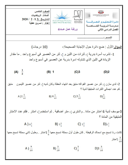 ورقة عمل في مادة الرياضيات للصف الخامس الفصل الثاني 2019 2020 العلوم والتكنولوجيا