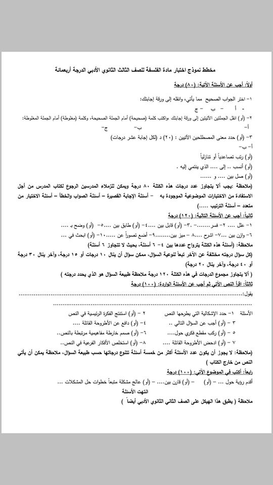 نمودج اختبار مادة الفلسفة للصف الثالث الثانوي الفرع الادبي