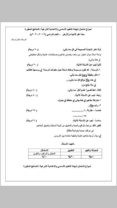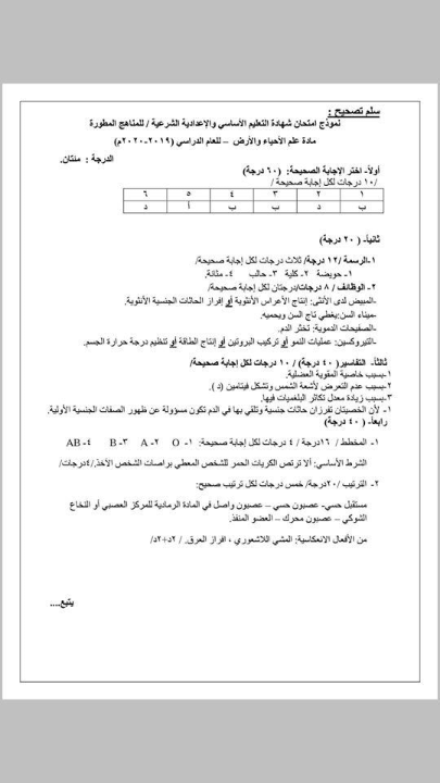 نموذج وزاري لعلم الأحياء لامتحان الشهادة الدراسة الثانوية دورة عام 2020 مع سلم التصحيح