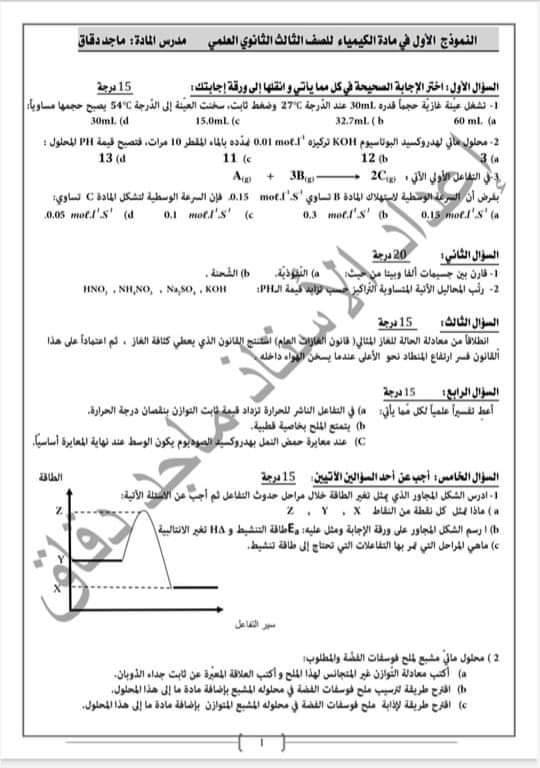 نموذج امتحان في الكيمياء للصف الثالث الثانوي العلمي 2019 2020
