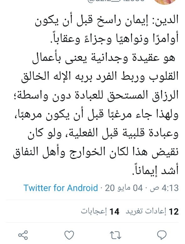 عبدالعزيز الخليفه On Twitter الإيمان قول باللسان وأعتقاد بالقلب وعمل بالجوارح ومن قال إن العمل غير داخل أوأن وجوده شرط كمال فقد ضل الطريق الموصل إلى الله