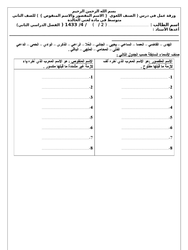 ورقة عمل في الاسم المقصور والمنقوصثثثثث